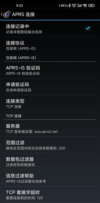 1.连接首选项:依次设置连接协议、APRS-IS验证码、连接类型、服务器、范围过滤信息。