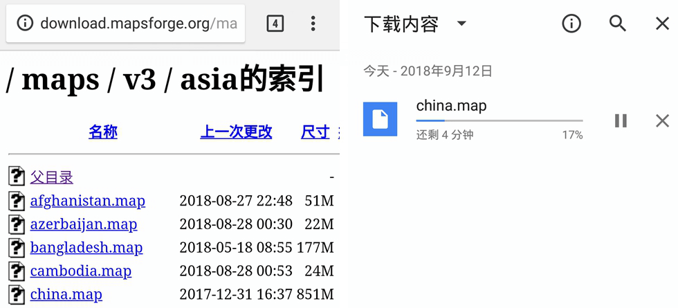 3.1.离线地图下载:进入MapsForge或 OpenAndroMaps,选择asia,点击china.map下载。