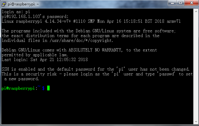 Putty登陆,账号:pi,密码:raspberry