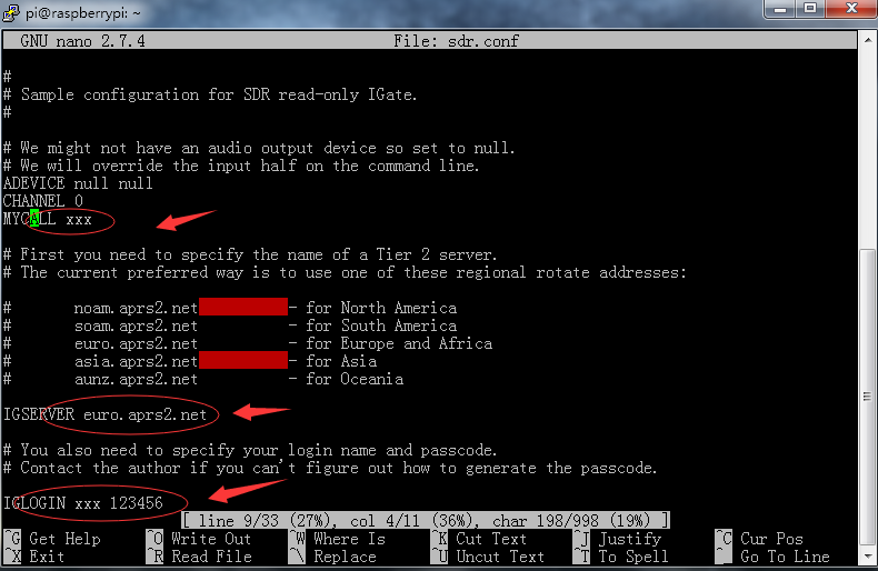 向下滚动到以IGLOGIN开头的行。将xxx更改为与您在上面输入的呼号相同(包括SSID),然后将数字123456更改为APRS验证码(之前的帖子有在线计算的网址)