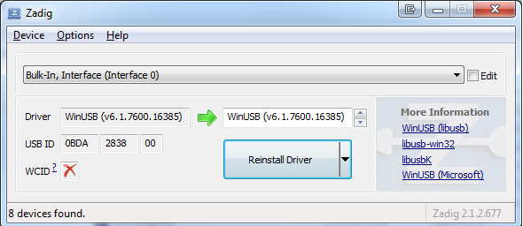 - 插入您的SDR,转到sdrsharp文件夹并运行 zadig.exe。转到Options,然后勾选“ List all devices”。选择“ Bulk-In, Interface (Interface 0) ”,然后单击“ Install Driver”。(这里的示例图片已安装好驱动)