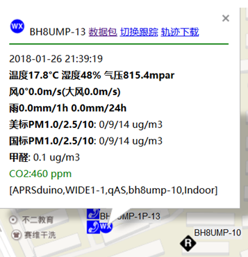 CO2:460 ppm 这是我自己定义的一个测量值,因为我有二氧化碳浓度传感器,所以上传该值。在aprs.cn上,甲醛之后就没有预定义字段了,但是你可以再加其他传感器,只要像我这样做出简要声明,系统会自动放在comment字段里显示出来。你也可以在这里写一些英文单词或句子,进行进一步说明。