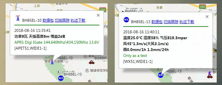 你可以通过带有aprs功能的手台、车台,或是专用的aprs设备查看信息;手机端使用流云aprs、APRSdroid等APP查看;电脑端登录202.141.176.2、aprs.cn、aprs.fi等网站查看。下图示即为电脑端查看到的BH8SEL-10(digital、igate) 和BH8SEL-13(weather)信息。