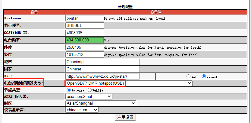 2.将PiStar中调制解调器类型更改为OpenGD77 DMR hotspot(USB)