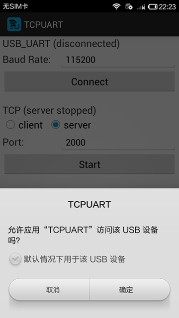 3.然后在TCPUART(传输速度115200)中,单击CONNECT,电话会问您是否允许?单击“确定”。然后在tcp服务器上单击“服务器”,输入2000,然后单击“开始”。此时, TCPUART可以后台运行。