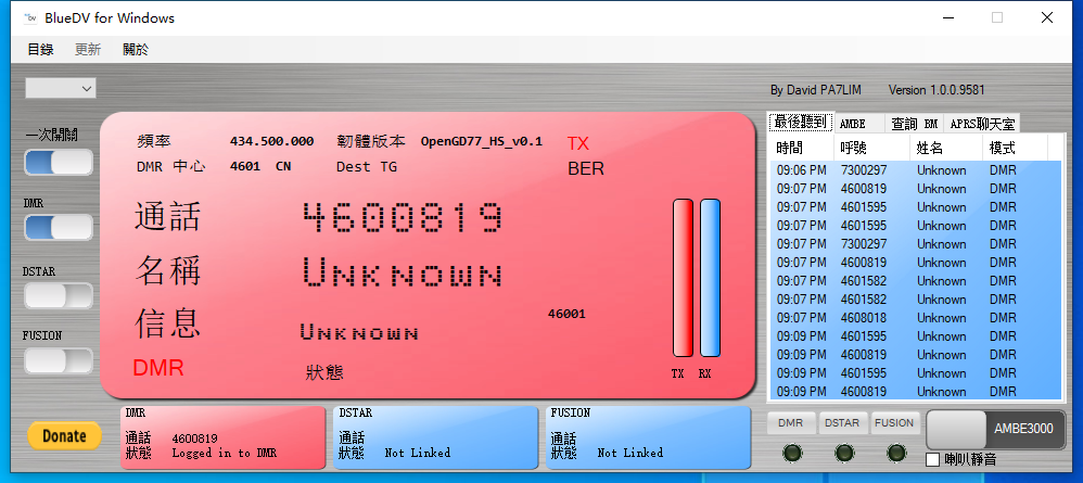 当PiStar从Internet接收流量并将其发送到热点进行传输时,热点将显示Callsign和名称或DMR ID,并显示TX频率。