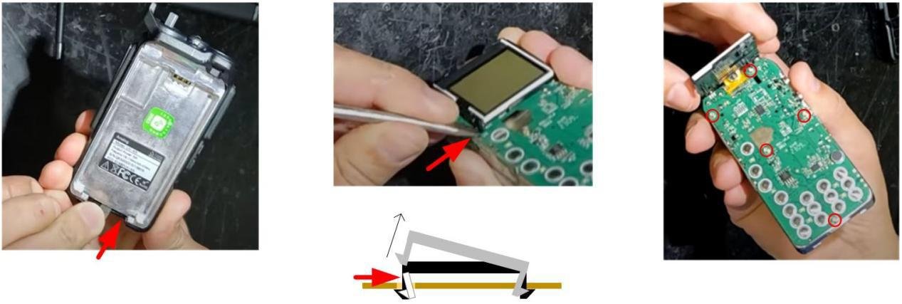 ⑥拆卸屏幕(难点,请认真看视频教程!)。在屏幕左下角卡扣位置,用撬棒向内按压 同时向上抬起即可拆卸左侧,屏幕左侧松脱后另一侧拆卸相对简单。此处用力不要过猛,控 制幅度,屏幕完全拆卸后应妥善固定,以免拉断、折断背面上方排线。
