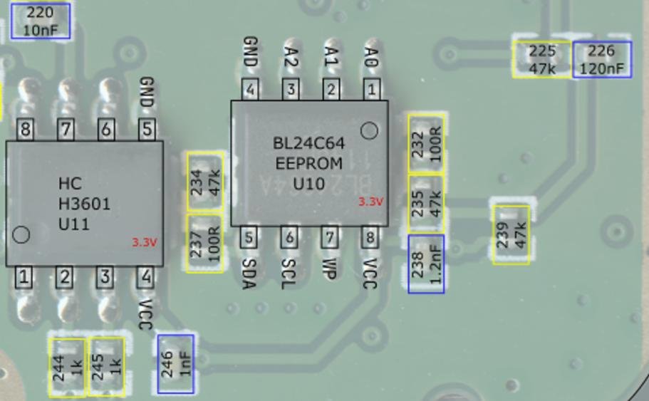 需要更换的芯片位于主板背面右下角,型号为 BL24C64A。