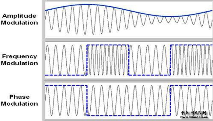 有三种调制方式,包括调幅(AM)、调频(FM)、调相(PM)。