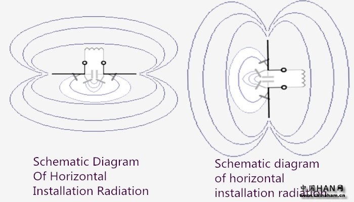 偶极天线的辐射方向垂直于振荡器的方向,即当天线从北向南竖立时,其辐射方向为东西向。因此,半波偶极天线的辐射图最多与导体垂直,在轴向方向上降至零。所以如果垂直安装,就实现了全向天线;如果水平安装,则为(更常见的)弱方向天线。