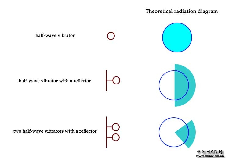 这样,添加一个振动器以使电磁波在水平方向上传播得更远,然后添加一个反射器来控制方向。经过这两次折腾,定向天线的雏形诞生了,电磁波发射方向变成了下图所示。