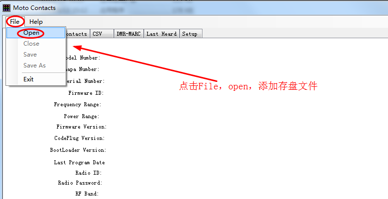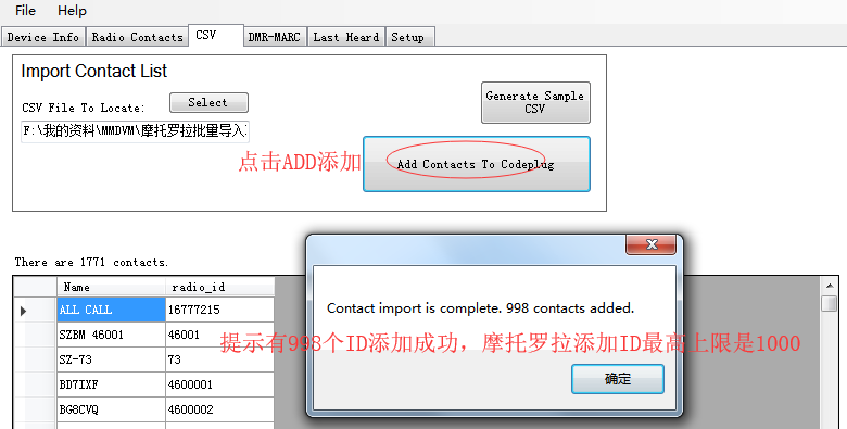 6、回到软件,依然是CVS界面,点击“select”添加上一步编辑好的CVS文档,然后点击“Add Contacts to Codeplug”添加CSV文档