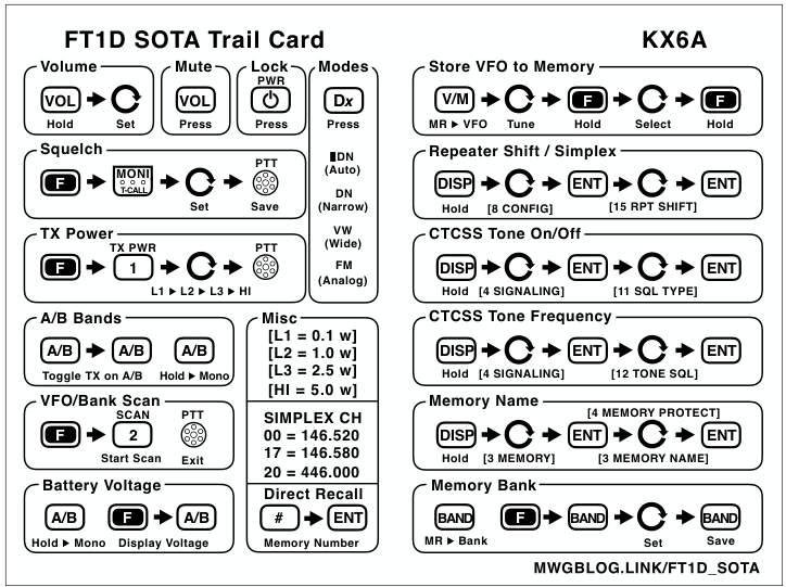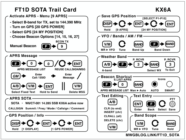 八重洲FT1D是一台集2m 、 70cm和APRS功能于一身的手台,灵敏度高,手感好,不过缺点在于菜单设置太过复杂,不经常使用就会忘记一些常用的设置,需要翻看说明书才能完成设置。此贴为KX6A所做的FT1D SOTA Trail Card(备忘单),虽然不能全面概括FT1D的所有设置操作,不过列举了一些常用菜单选项,适用于 FT1DR、FT1DE、FT1XDR、FT1XDE用户。