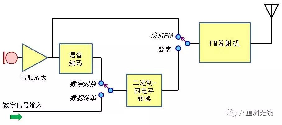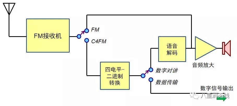 C4FM的英文全称是Constant Envelope 4-Level Frequency Modulation,即连续包络4级频率调制。它和大家熟知的传统模拟调频FM没有实质区别,只是调制射频输入信号的不是语音的模拟信号,而是只有四种电平状态的数字信号。