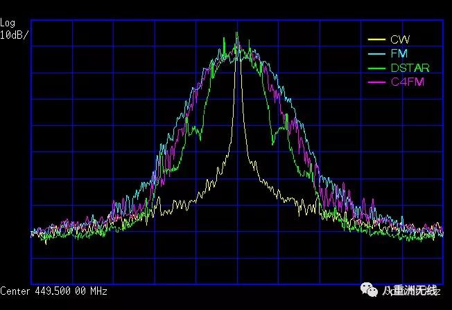 另一个因素是频谱的形状。图3是未调制载波CW(黄色)、强语音调制的模拟FM(天蓝色)、DSTAR(绿色)和C4FM(紫红色)四种信号频谱图的叠加比较。可以看出,C4FM和模拟FM信号的带宽相仿,在-26dB时约为12.5kHz,ICOME DSTAR带宽稍窄,-26dB时约为10kHz。