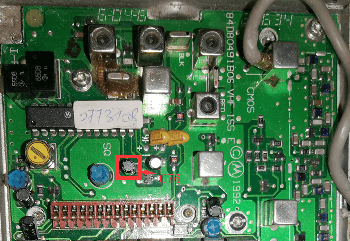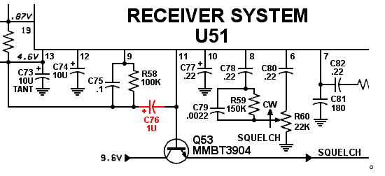 另外,通过静噪电路改进,可消除静噪延迟提高对弱信号的接收能力,改造方法是直接拆除掉C76即可(红圈中电容50V/1UF)。