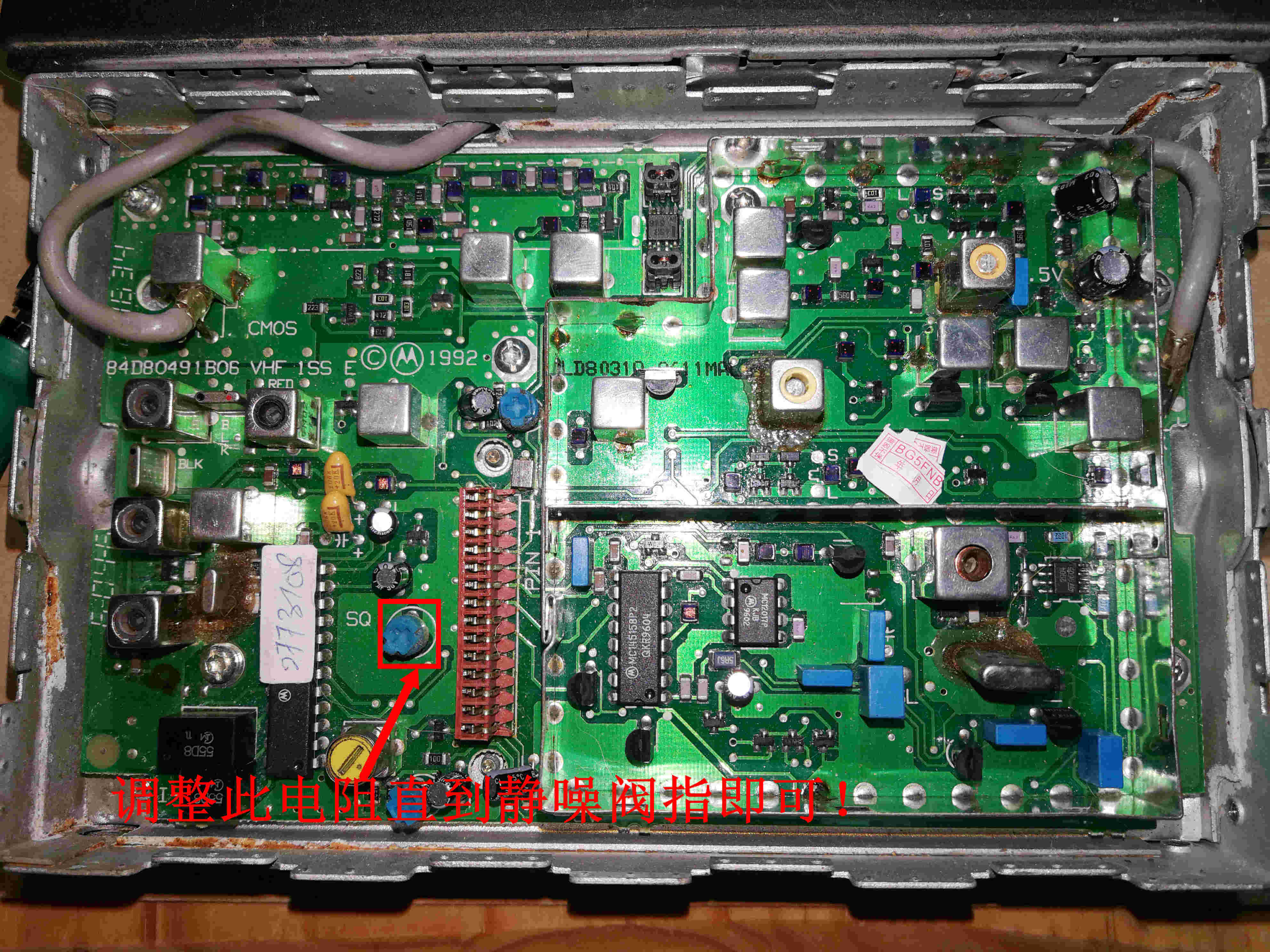 拆除螺丝后,打开上盖,在电路板上找到标注有"SQ”字样的电阻,机器通电开机,调整此电阻后,静噪常开现象消除,稍作微调至静噪阀指即可。