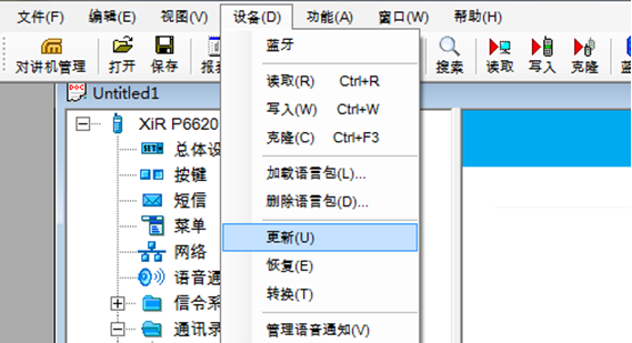 3、安装完成后,连接待升级设备和电脑,启动设备和编程软件,找到工具栏中“设备”选项里的“更新”项,并点击该项,如下图: