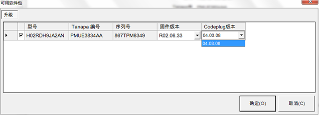 5、选择相应的版本,然后点击确定。一般情况下固件版本和CODE plug版本只有一个选项可以选择,若出现多个可选择版本,请选择最新的版本(版本新旧判断:靠前的数字越大版本越新,CODE plug版本越新整体版本越新),下图为更新进度条框: