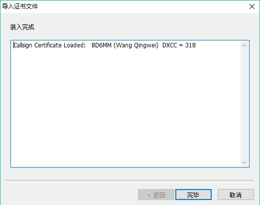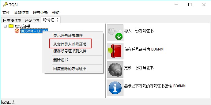 1、打开TQSL,然后点击“呼号证书”选项卡,在里面已经可以看到我们申请过的呼号,但是前面有个禁用标识,说明目前还没有验证TQ6证书文件。接下来,我们右键点击呼号,在新菜单里选择“从文件导入呼号证书”,或者在右侧的窗口中,点第一个带钥匙的图标,会出来导入证书完成对话框。