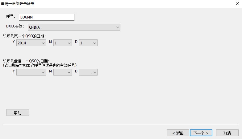 在新窗口中输入自己的呼号,DXCC实体选择:CHINA,然后选择该呼号第一个QSO的日期,*注意* 如果非过期呼号或者目前呼号还在正常使用,请不要选择“该呼号最后一个QSO的日期”,点击“下一个”按钮。