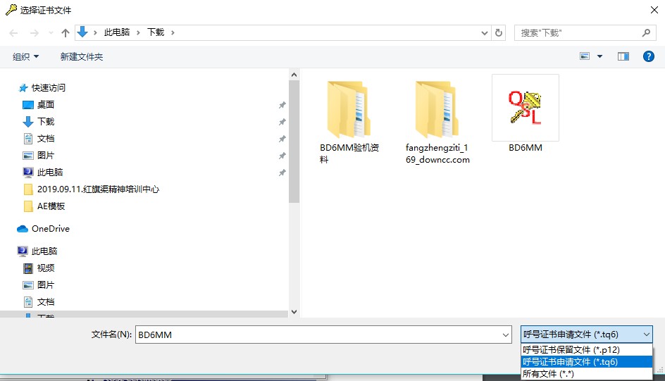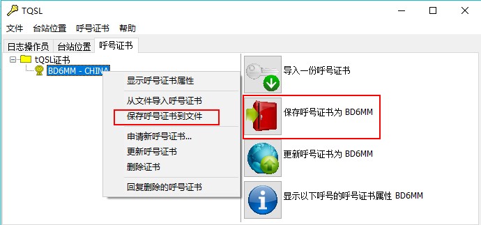 3、前面说的TQ6证书文件用于验证申请,它只能使用一次,目前已经失效。为了以后更换电脑或者重新安装操作系统后使用Lotw方便,现在我们需要把验证成功后的呼号证书备份下来。右键点击“呼号证书”选项卡下面要备份的呼号,在新菜单中选择“保存呼号证书到文件”,或者在右侧窗口中,点第二个像保险箱一样的红色图标,会出来保存证书对话框,选择合适位置妥善保存这个后缀为P12的证书文件。万一以后更换电脑或者重新安装操作系统,我们可以通过导入这个备份的证书文件来使用Lotw。