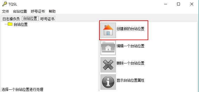 1、打开TQSL,点击“台站位置”选项卡,然后点右侧窗口里的房子图标,创建新的台站位置。