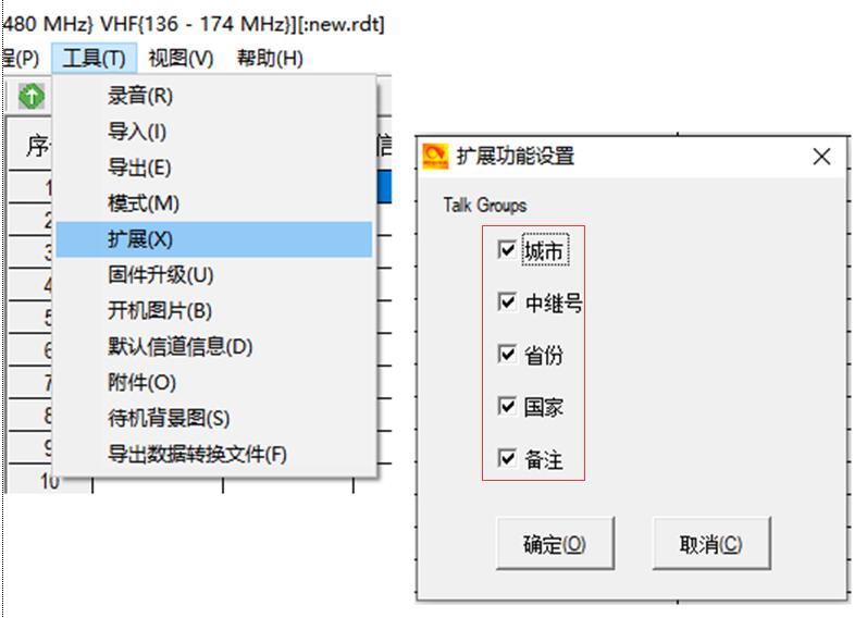 如果通话组,联系人要显示额外信息,需要写频软件选择工具→扩展,勾选“Talk Groups”相应选项。