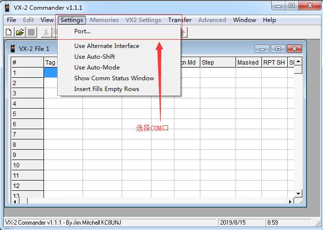 2.选择菜单栏第3项“settings”,下拉菜单选择“port”,在弹出的对话框中选择写频线所连接电脑的COM口