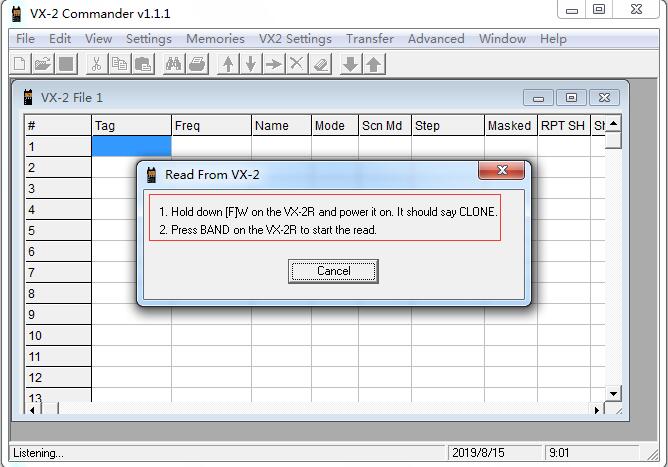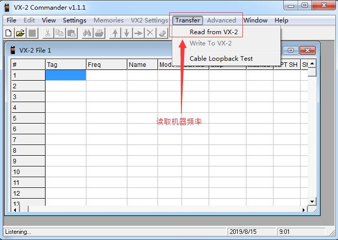 3.选择菜单栏第6项“Transfer”,下拉菜单选择“Read from VX-2”