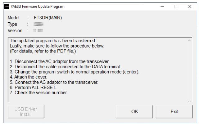 10.此时,可以退出固件更新程序。点击 YAESU固件更新程序的【OK】按钮,返回到固件更新模式,按【Exit】退出程序。