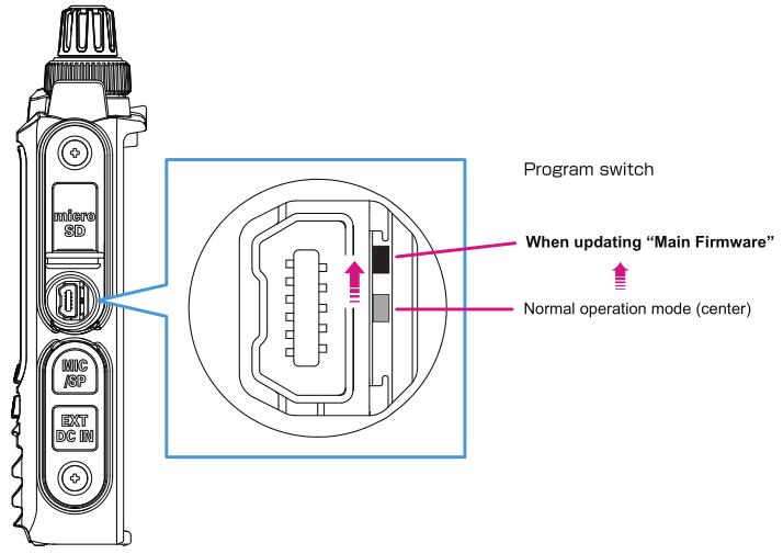 2.将FT3DR / DE的“写入程序”开关向上移至“写入主程序”模式,然后使用随附的USB编程电缆将FT3DR / DE与电脑连接。