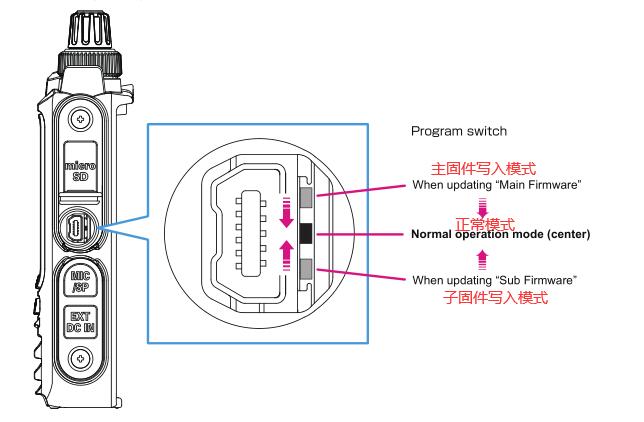 注意:程序写入开关位于右侧外壳的DATA插孔正后方,请小心提起microSD和DATA插孔盖即能看到。