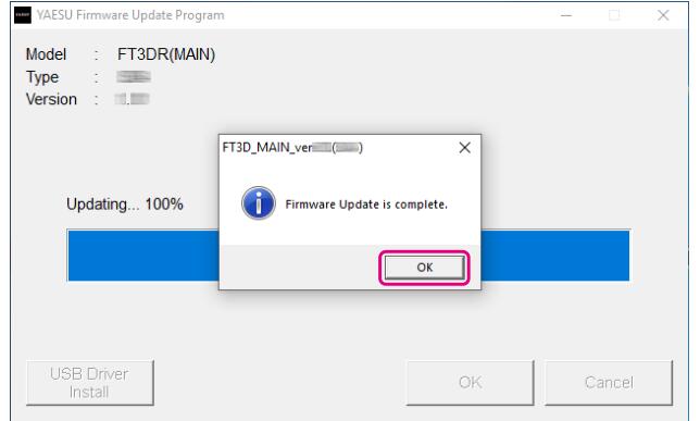 5.固件传输开始,执行固件更新(主固件:大约20秒完成;子固件大约90秒完成。)。 固件更新完成后,显示一条消息,点击【确定】按钮。