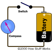 电池通过其两端之间的电线传送电力。移动的电子在电线周围产生磁场,其强度足以影响罗盘。