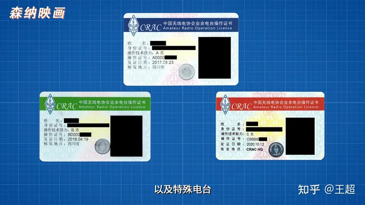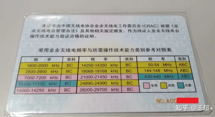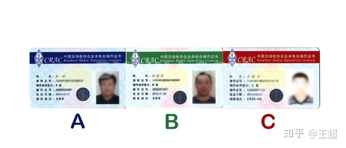 业余电台操作证是一张和身份证大小一样的卡片,可分为ABC三类,不同类别可发射的频率范围、发射功率有所不同: