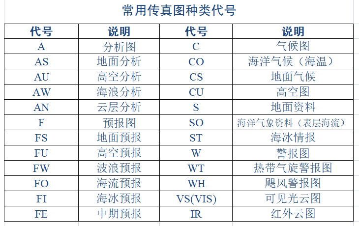 种类:气象传真图的内容丰富、种类繁多。航海最常用的气象传真图主要有: