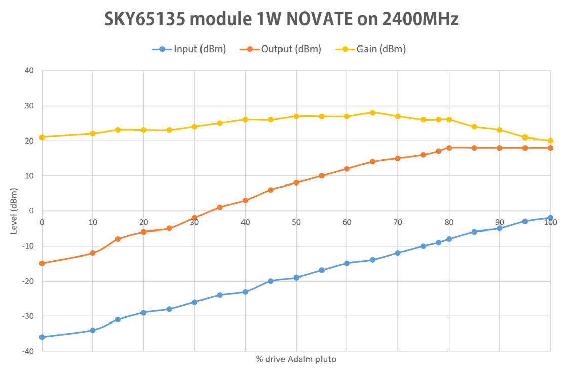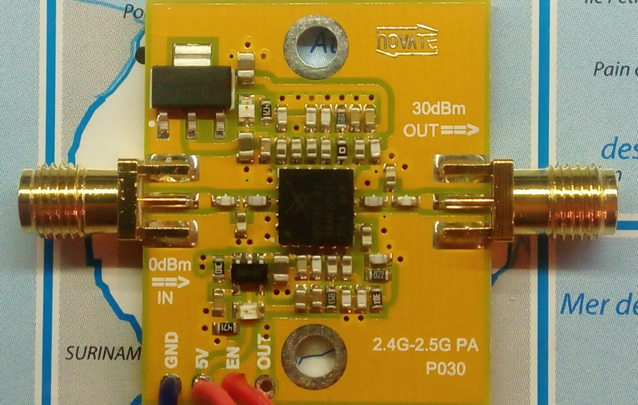 这款小型NOVATE SKY65135板在易趣上售价约25欧元。它被指示能够在2.4GHz下输出1W,并且由5VDC供电,并且可以适合作为SDR发射器输出,其可以被用于向卡塔尔Oscar 100 QO-100传输