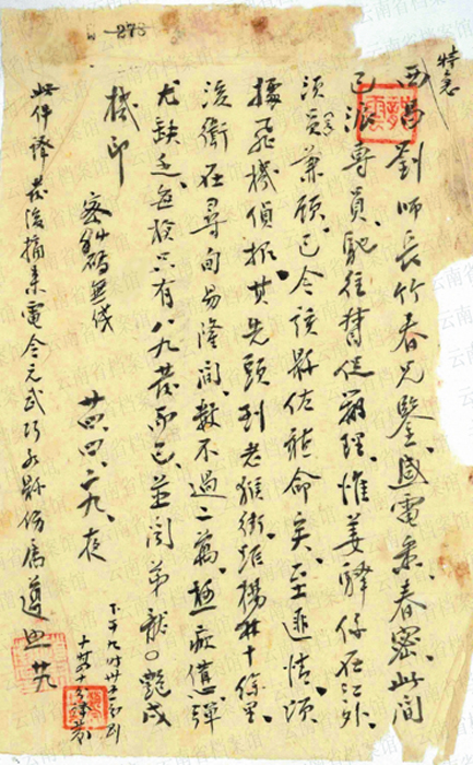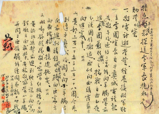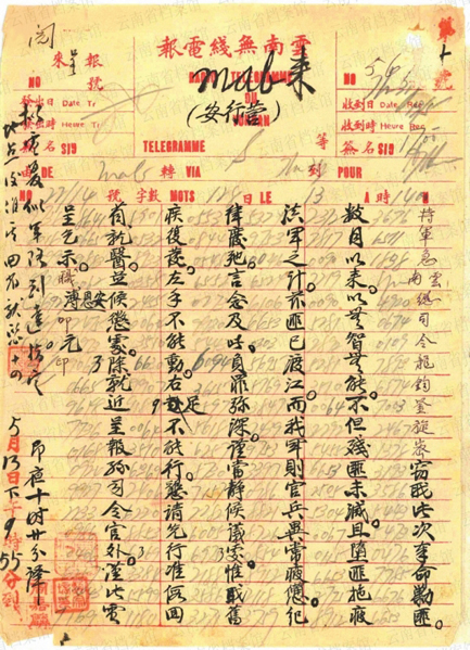 1.1935年4月26日,红一军团、五军团各一部对曲靖城进行包围监视,主力准备在沾益、曲靖、老马场地区回击滇军安恩溥旅。图为4月27日曲靖县罗佩荣发给龙云的特急电文,报告4月26日夜红军围攻曲靖。